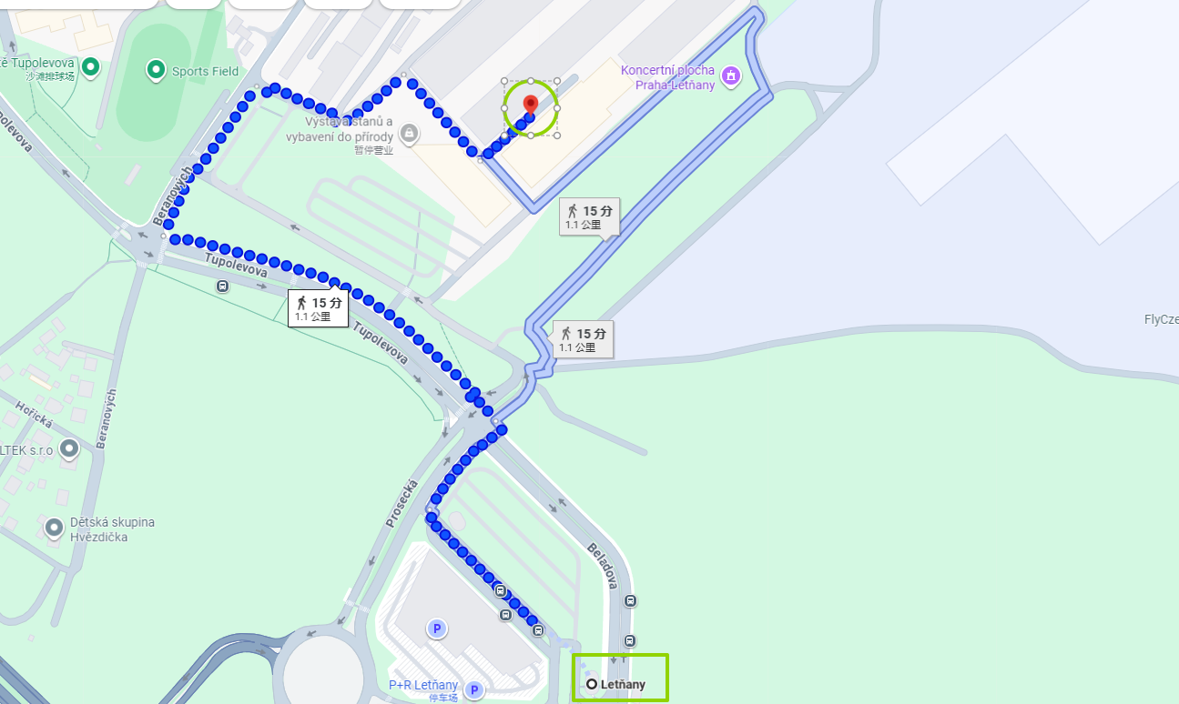 Letňany (मेट्रो C) + अंदाजे 15 मिनिटे चालणे